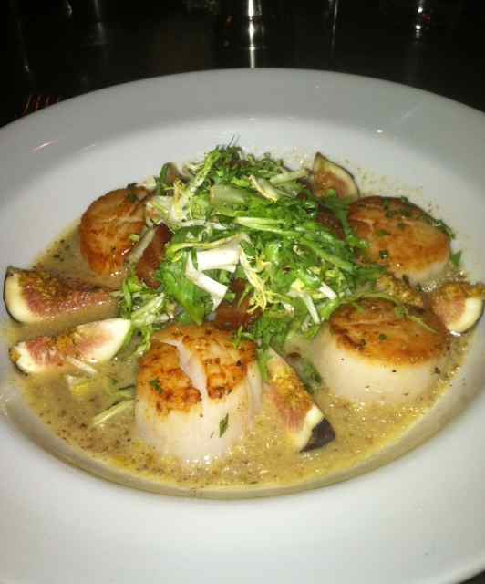 My Seared Scallops Served with Sweet Potato Confit, Frisée, Fresh Figs, Grain Mustard and White Wine Sauce