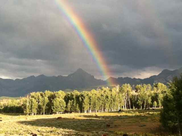 Thank you to my trusty iPhone for the above pictures. The rainbow was our reward after a long drive home to Telluride. It shines on Ralph Lauren’s ranch and some of the most glorious peaks of the San Juan Mountains. In the distance you can spot Mt. Sneffels, one of our famous fourteeners.